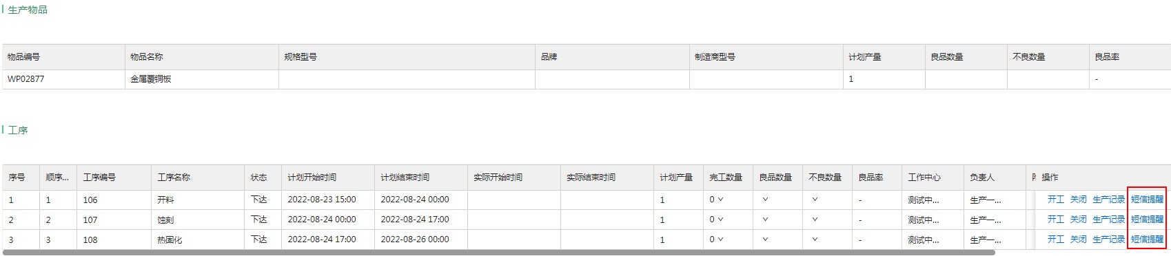 工單短信提醒功能,支持為指定工序工作中心內(nèi)員工發(fā)送短信提醒。